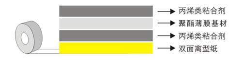 采用黑色PET基材,并在黑色PET基材上涂壓敏膠合劑的雙面膠帶。具有優良的遮光性和粘合力。